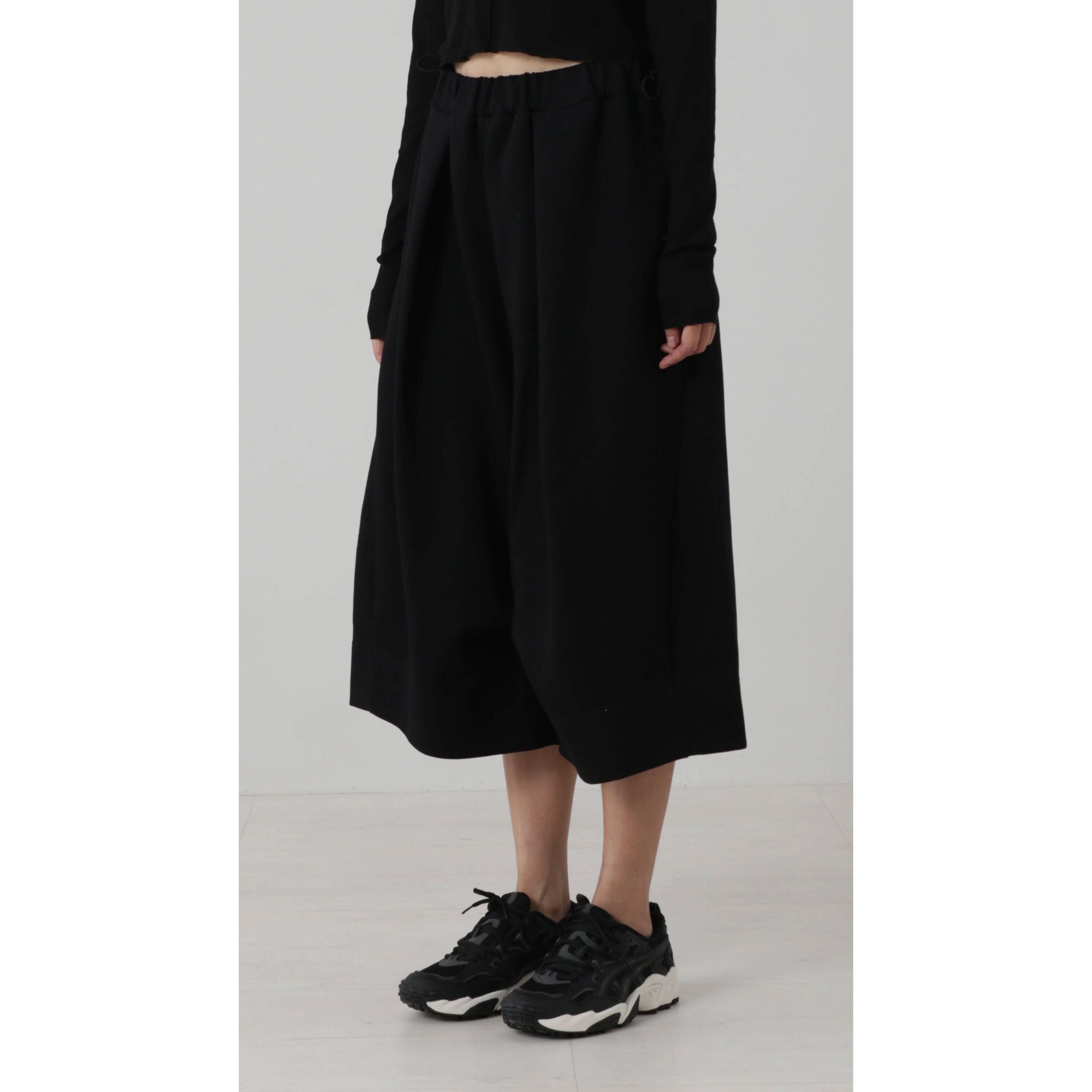 両サイドの切替え位置を大きく前にカーブさせる事で立体的なシルエットを構築しました。裾に向かって太くなったシルエットが存在感のあるガウチョ丈のパンツです。