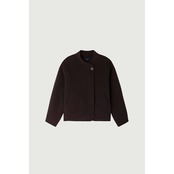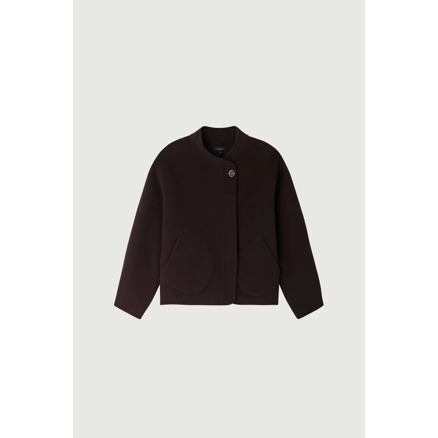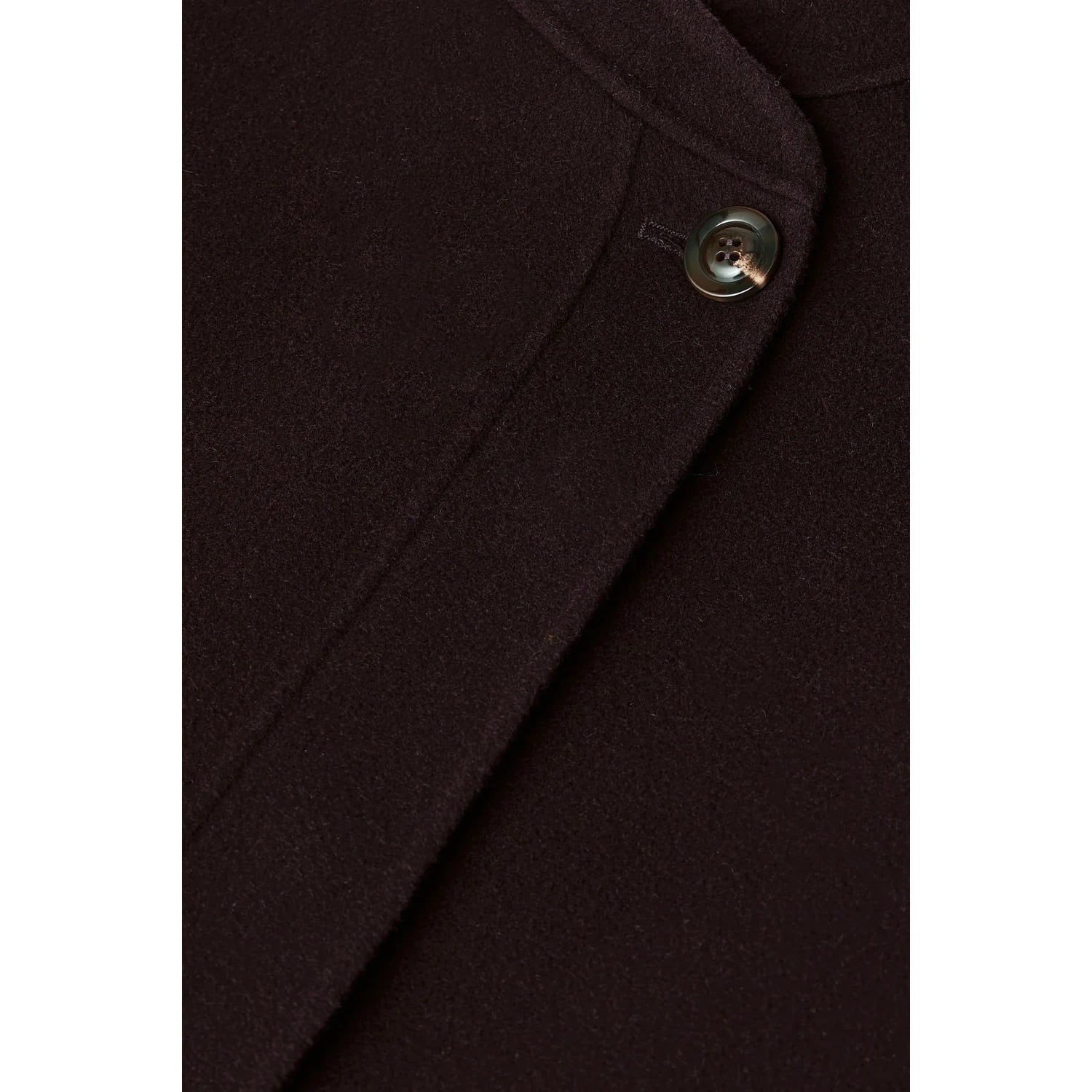 - Stand-up collar, asymmetrical overlap and semi-concealed buttoned fastening